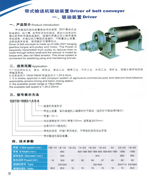 帶式輸送機驅(qū)動裝置是由會去滾筒、ZGY懸掛式齒輪減速機、扭力臂、皮帶輪及電機組成,其動力由電動機通過皮帶輪傳遞給減速機,減速機再通過空心軸傳遞給傳動滾筒,并通過扭力臂固定減速機,可配置逆止裝置。該系統(tǒng)具有安裝、使用維護方便等特點。廣泛應(yīng)用在農(nóng)業(yè)、商業(yè)、郵電業(yè)、食品工業(yè)、煙草工業(yè)、汽車工業(yè)、水泥工業(yè)、采礦業(yè)、混凝土攪拌站的皮帶輸送系統(tǒng)。